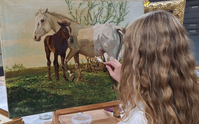 Het schoonmaken van schilderijen is een complexe ingreep. Onze restaurator beschikt over gespecialiseerde kennis over het gebruik van verschillende reinigings- en oplossingsmiddelen. Zij kan zo de juiste keuzes maken, specifiek afgesteld op jouw werk. Ieder schilderij is immers uniek, de materialen vaak kwetsbaar.